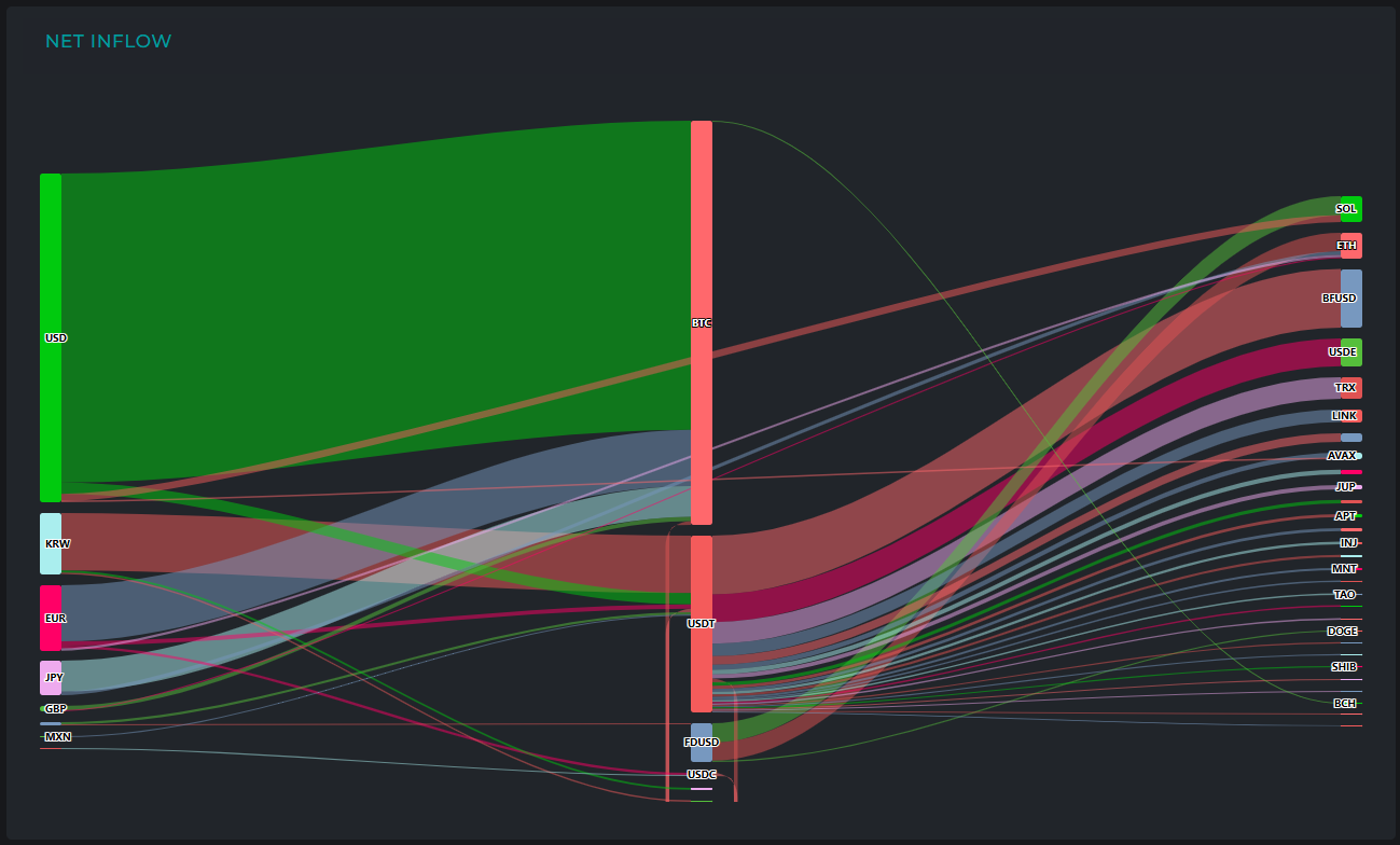 资金流向呈现显著重构趋势 当前市场同时出现大规模主流资产外流与稳定币/法币集中流入的现象,资金分布格局正在发生明显变化。 法币资金流入分布 截至26日统计数据显示:日元基础资金流入2240万美元,其中1910万美元集中于比特币,330万美元流向以太坊。欧元基础资金2670万美元呈现四类资产集中流入态势,1220万美元转换为比特币,980万美元流入USDC,190万美元分别流向以太坊与USDT。美元基础资金1340万美元呈现分散流向,710万美元注入ADA,300万美元转入SUI,240万美元流向TAO,85万美元进入BONK。韩元基础资金790万美元全部转入USDT,呈现单一资产集中特征。土...