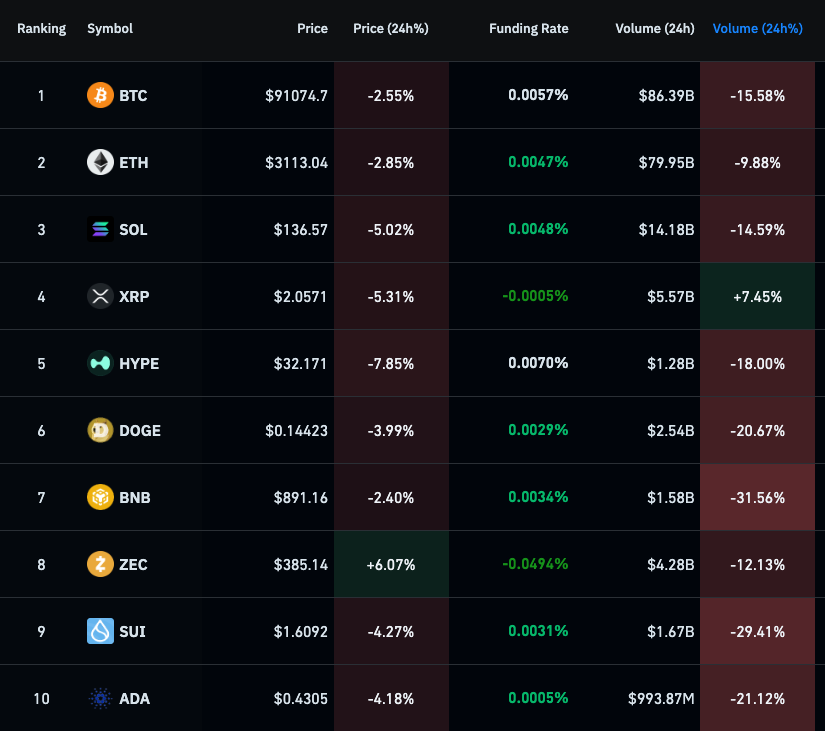 加密货币市场遭遇回调 12月5日,加密货币市场普遍下挫,比特币及大多数山寨币均呈现跌势。与此同时,爆仓金额出现反弹,而持仓量则有所下降。 市场概况 周五加密货币市场承压,比特币与山寨币跌幅均超过2%。此次下跌伴随着爆仓量激增与持仓量下降。部分代币在价值45亿美元的期权到期事件前亦出现下跌。比特币价格从本周早些时候的93000美元上方回落至90000美元以下。跌幅较大的代币包括Canton、MYX Finance、Aptos、Hyperliquid、Morpho和Aerodrome Finance等。 持仓量持续收缩 此次市场下跌与期货市场日内持仓量大幅缩减同步。持仓量下降4.35%至127...