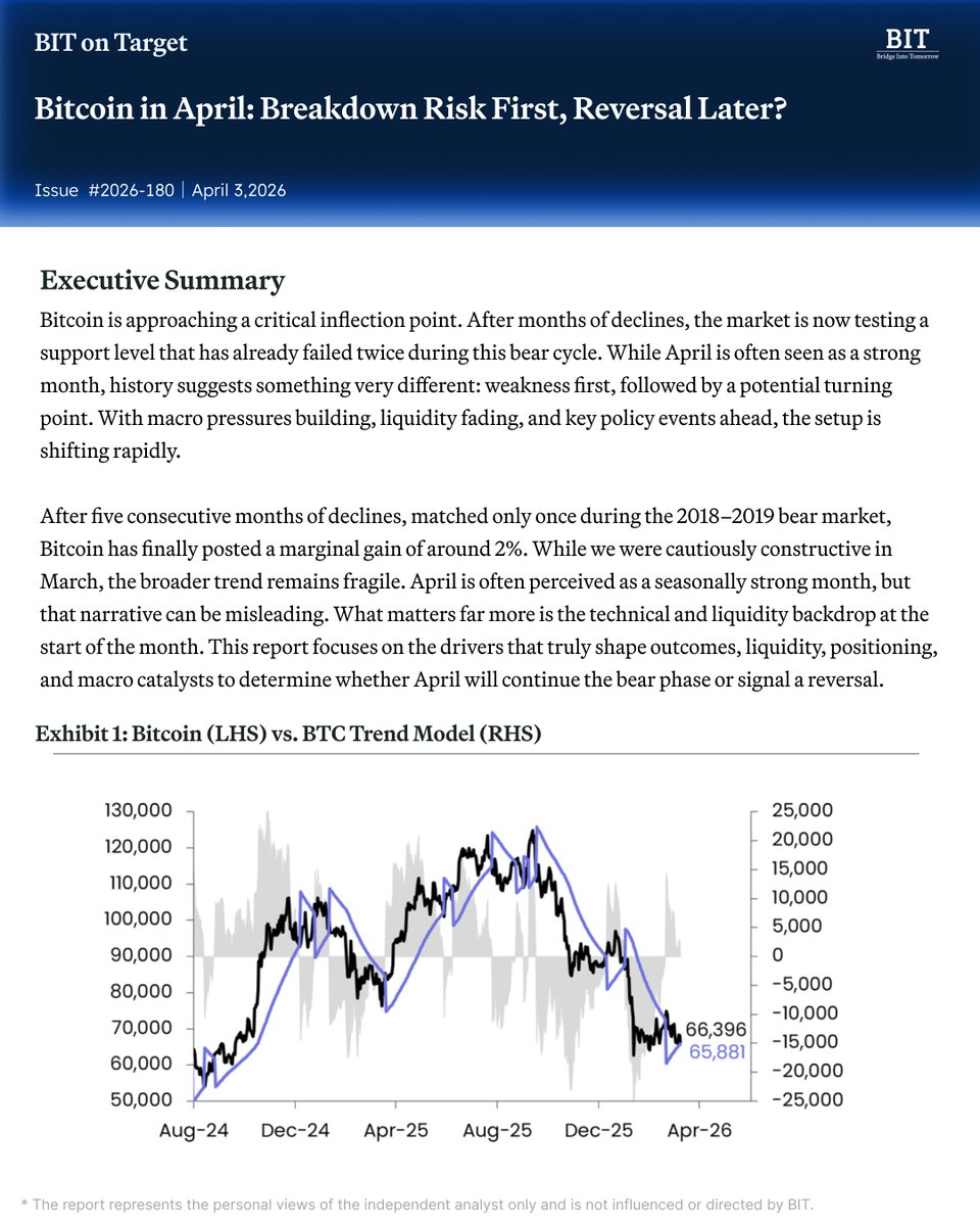 根据BIT分析,比特币在经历近期反弹后,已进入重新试探此前调整阶段所脱离的关键支撑位的区间。不过分析指出,整体复苏态势仍不稳定,且趋势较为脆弱。 市场逻辑变化与关键影响因素 分析认为,持续存在的宏观经济压力、流动性减弱以及重要政策公布前的不确定性,正在改变市场价格形成的逻辑。因此,四月市场方向将更依赖于技术走势、流动性条件以及宏观变量的变化,而非季节性规律。 复苏的必要条件 BIT表示,若要在四月出现复苏态势,需要流动性改善、投资组合配置调整以及外部催化因素共同作用。若这些条件无法满足,市场可能延续调整局面;反之,若条件相互配合,市场则可能逐步趋于稳定...