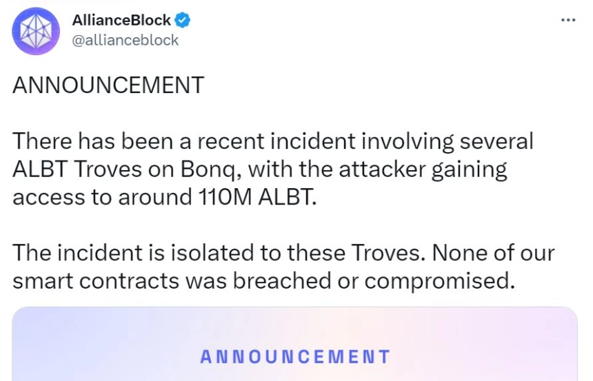 DeFi项目AllianceBlock遭遇黑客攻击,损失数百万美元 当地时间1日,DeFi项目AllianceBlock发布公告称遭遇黑客攻击,造成数百万美元的损失。据悉,黑客侵入了AllianceBlock的自主代币ALBT,共窃取1.1亿枚,按攻击前的价值计算,约合1200万美元(约合146亿韩元)。 在黑客攻击后的数小时内,ALBT价格从0.11美元暴跌至0.04美元,市场预计其价格将继续下跌。AllianceBlock表示,黑客入侵了与DeFi流动性协议Bonq相关的、由用户直接管理的智能合约Troves。 黑客正在处理窃取的代币 有消息称,黑客正在处理窃取的代币并将其变现。T