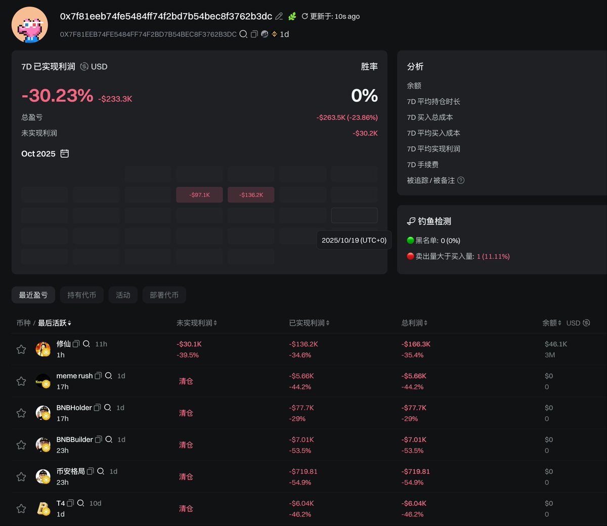这个本来是赚钱的,因为修仙随后涨到了 $4000 万市值,不过他没卖。后面跌下来他在 1 小时前以 $1650 万的市值割肉了大部分亏损 $16 万。