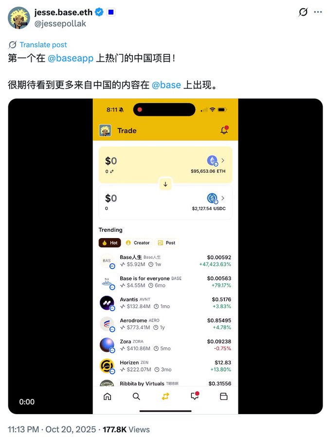 在半小时后,Base 创作者兼协议主管 Jesse Pollak 也发推表示:「Base 人生」是第一个在 Base App 上热门的项目,很期待看到更多来自中国的内容在 Base 网络上出现。