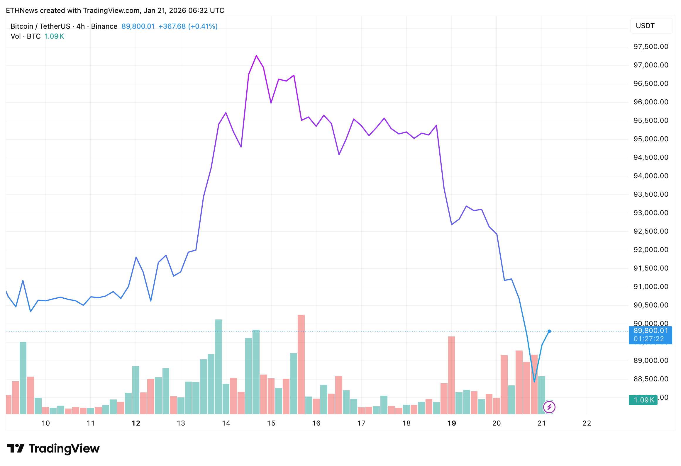 比特币四小时图表显示,在试图维持高位失败后出现急剧逆转,价格从约95,000美元区间滑落至89,000–90,000美元区域后暂时企稳。这一走势反映出短期结构的明显转变:上涨动能迅速消退,价格转跌后抛压加剧,截至截图时比特币交易价格接近89,800美元。