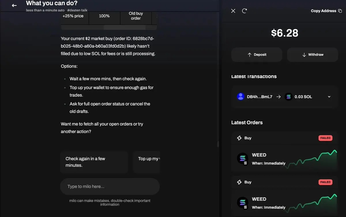 结果显示,这些代理仍有局限。例如,它能成功识别热门代币,但无法顺利执行买入操作;还出现了两笔交易失败,系统提示「余额不足」,尽管账户中实际上有足够的 SOL 用于支付手续费。