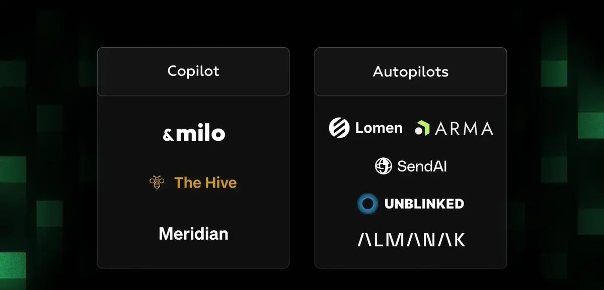 一类是 Copilots,它们引导用户在整个 DeFi 世界中做出决策;另一类是 Quant Agents,更偏向专业自动化策略执行,相当于「自动驾驶(Autopilots)」。