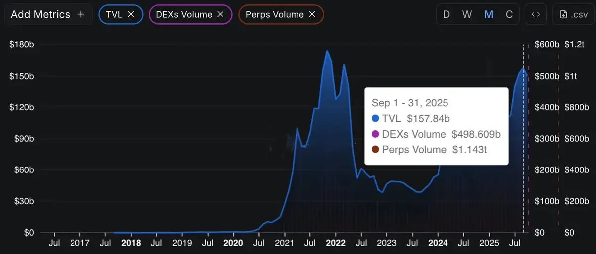 数据本身就能说明一切:机构资金单季流入超过 100 亿美元,分布在数十条链上的活跃协议数量突破 3000 个。全网 DeFi 协议的总锁仓量在 2025 年达到 1600 亿美元,同比增长 41%;DEX 与 Perps 的累计交易量更是以「万亿」为计。