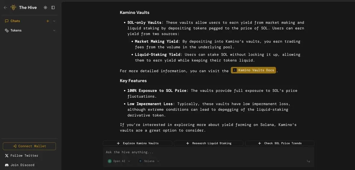 类似的平台 The Hive 则采用了不同路径——它将多个 DeFi 代理组成一个「蜂群」,能协同完成跨链、收益策略、清算防御等复杂任务,所有操作都通过一个简洁的聊天界面协调执行。这种由专用代理组成的网络,可以用自然语言指令完成多步骤的链上操作。