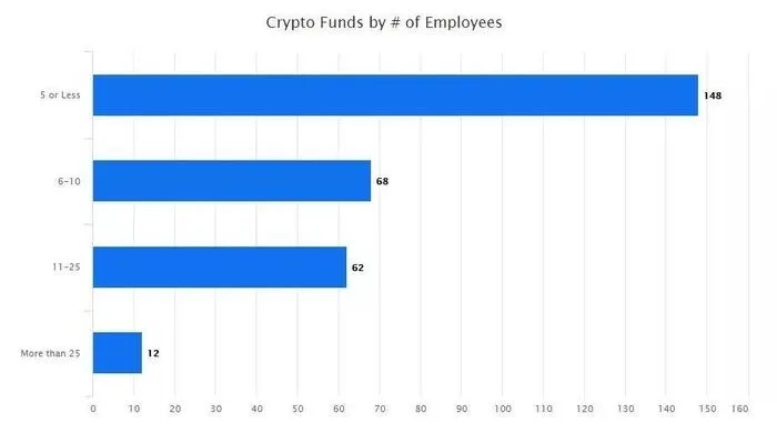 多数加密货币基金人员规模也比较小,由创始人和一两位辅助人员运营。多数加密货币基金员工数量在4–10人之间。有不到5%有超过25位员工,这类的基金都是不光投资加密货币资产的风险投资基金。