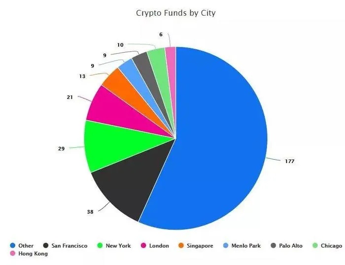 拥有加密货币基金较多的城市都是已经拥有很多对冲基金和风险投资基金的城市。排名榜首的城市是旧金山,因为它原本就是风险投资基金领域的霸主,紧随其后的纽约则是毫无争议的对冲基金大本营。