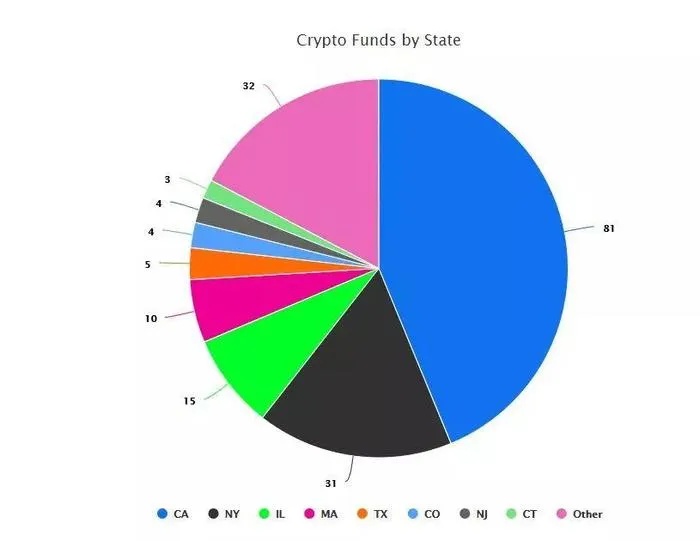 加州的加密货币基金在美国各州排名榜高居榜首。以旧金山和硅谷为首,加州占到了全美加密货币基金的半数。