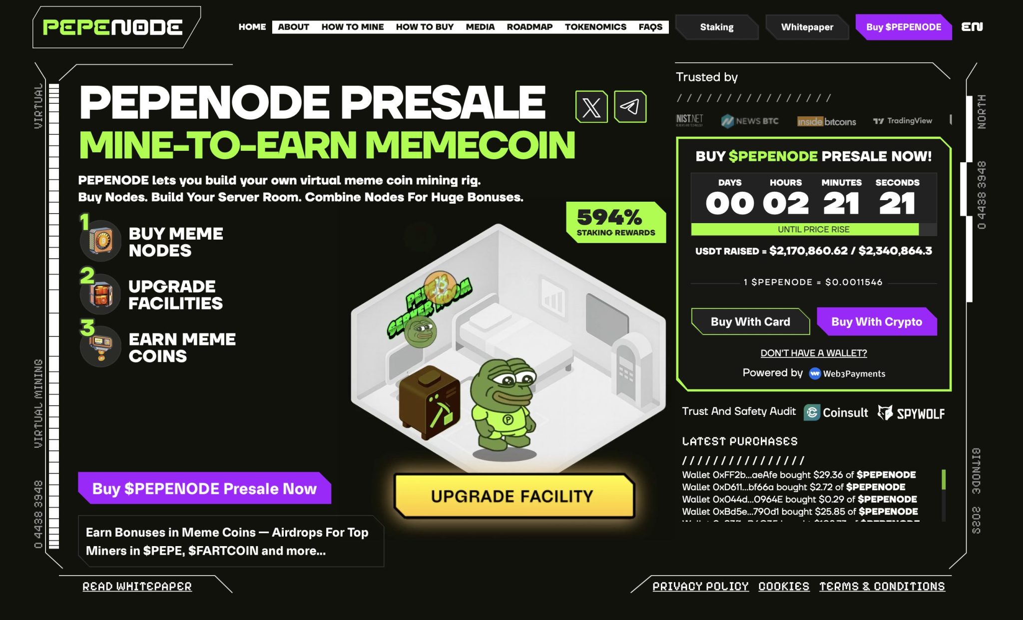 用户可以通过花费PEPENODE购买更多虚拟挖矿节点,从而获得更大的奖励,该协议将以Pepe和Fartcoin等知名代币支付这些奖励。