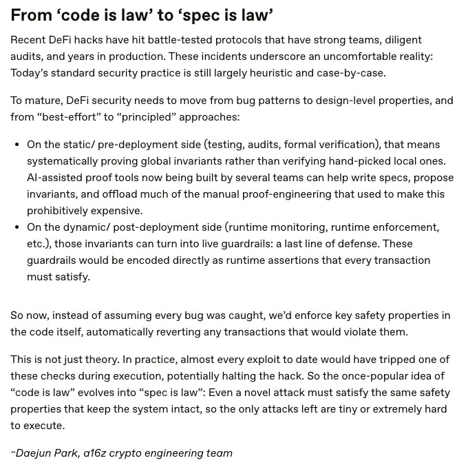 a16z得出的结论(也是业界目前普遍认同的结论)是,安全必须向上提升一个层次:从检查代码是否正确,到强制执行系统级不变性是否绝对不容破坏。这标志着安全策略从“代码即法律”向“规范即法律”的转变,协议正式定义了哪些规则必须始终成立(例如抵押品限额、价值守恒、偿付能力条件、排序约束),并持续强制执行这些属性,而不仅仅是在部署时才执行。