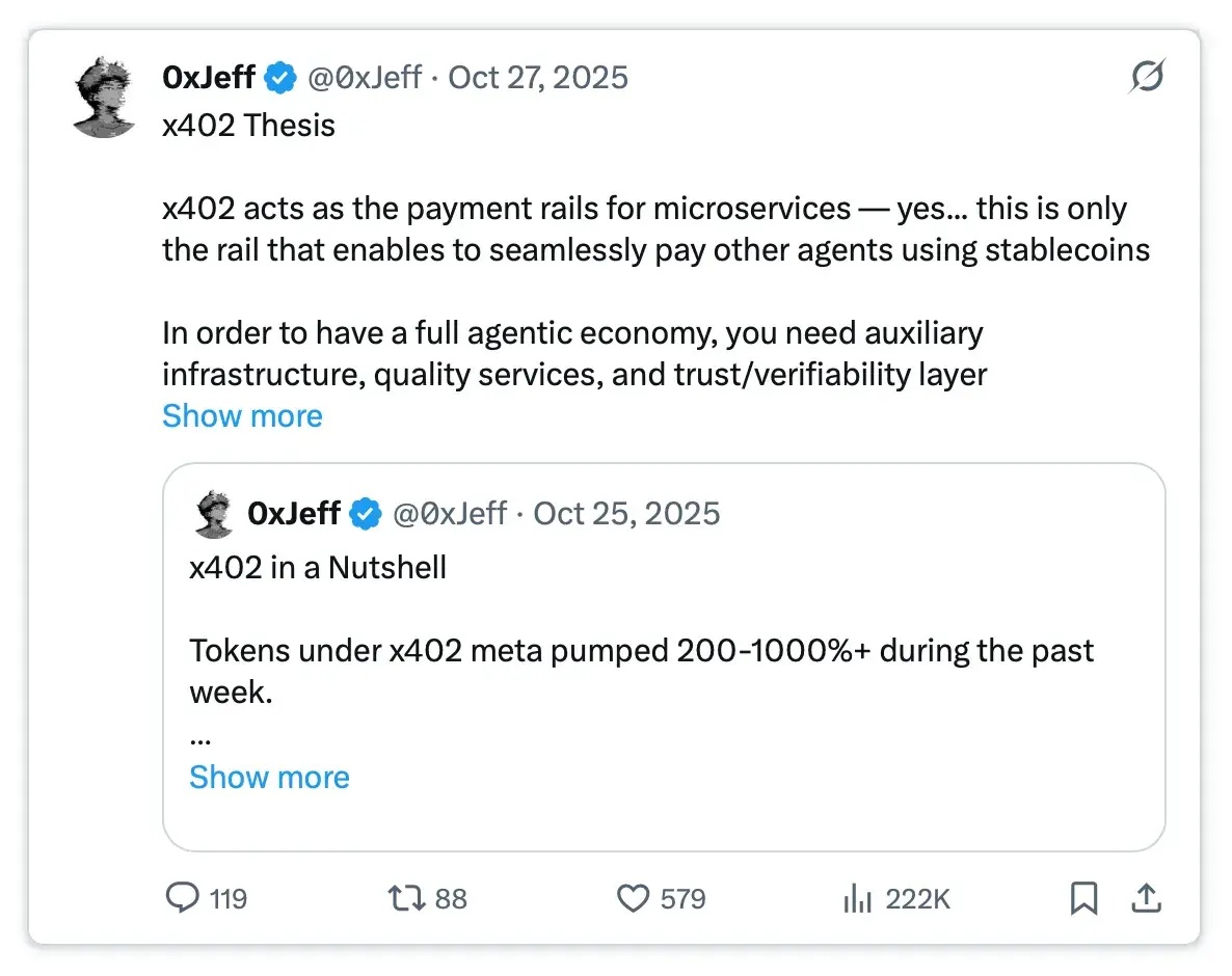 ● x402生态系统:关注点:通过原生HTTP级结算,推动“为Agent服务”及“由Agent执行”的可编程支付的进展。