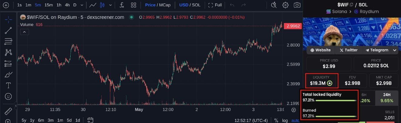 Dexscreener 和 Dextools 等网站会显示流动性是否被锁定。上面的例子显示,WIF/SOL 货币对锁定了 1,900 万美元的流动性。这并不能保证 WIF 会上涨,但它确保了交易的方式,无论是买入还是卖出。