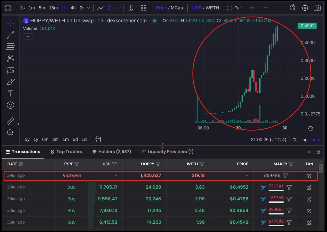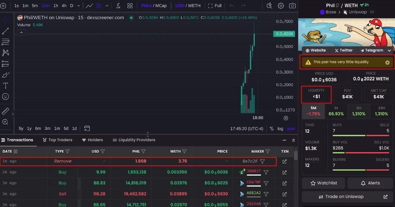 然后,如下图所示,项目的流动性被取消,交易变得困难甚至不可能。项目所有人或团队携款消失。