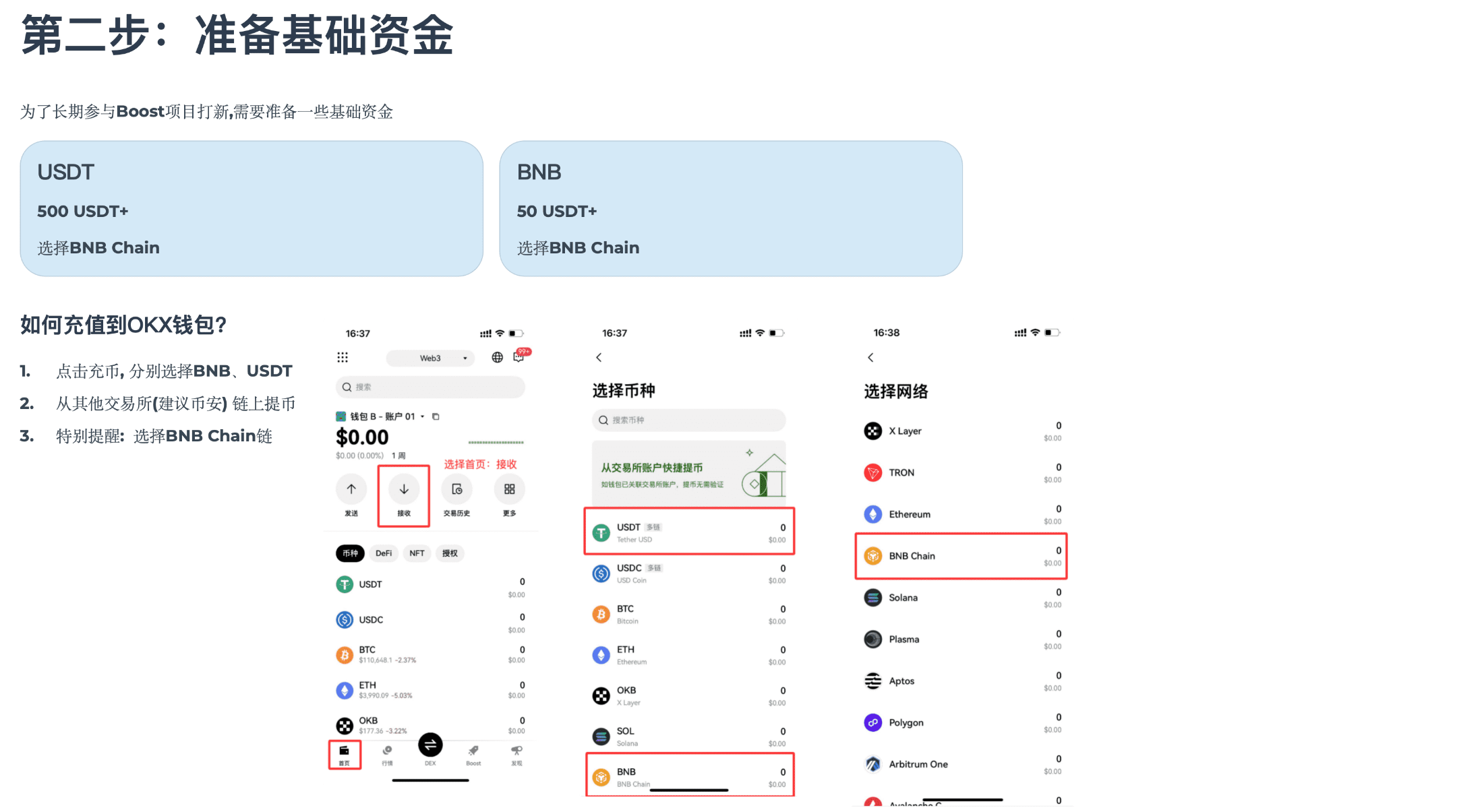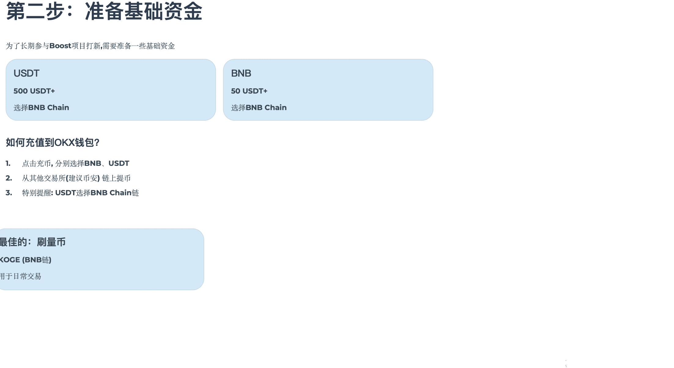接下来咱们就聊聊,怎么刷 OKX BOOST 领空投。相信到这一步,大家都认识钱包、也有自己的钱包了,那咱们就不来虚的,直接说投资的事。做投资嘛,首先得准备点资金 —— 老祖宗都说了 “兵马未动,粮草先行”,所以这次我特意给大家分析了,该准备多少 “粮草”,才能赢过市场上大多数人,做到次次都像 “草船借箭” 那样,满载而归。这就是咱们需要准备的资源: