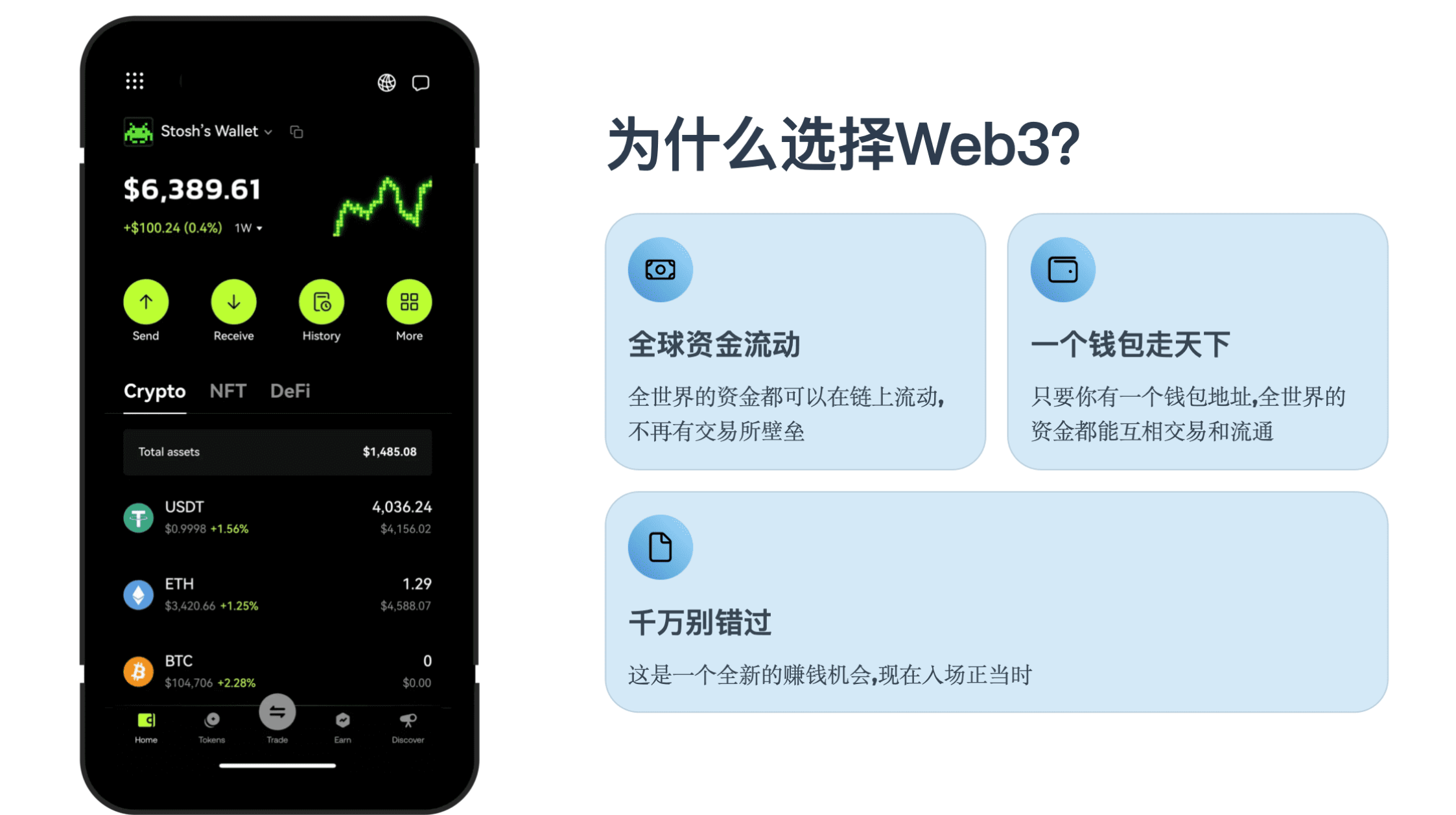 全世界的钱都能在链上自由转,没有交易所那种条条框框的限制,你只要有个钱包地址,就能跟全球的资金做交易、搞流通。要是你还没踏进 Web3 的门,那这场直播可千万别划走,我手把手带你入门