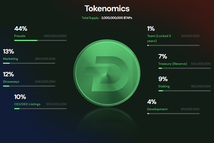 预售分配了总供应量的44%,即880,000,000 TAP代币,而13%(260,000,000代币)分配给市场营销,12%(240,000,000代币)预留用于社区赠品。