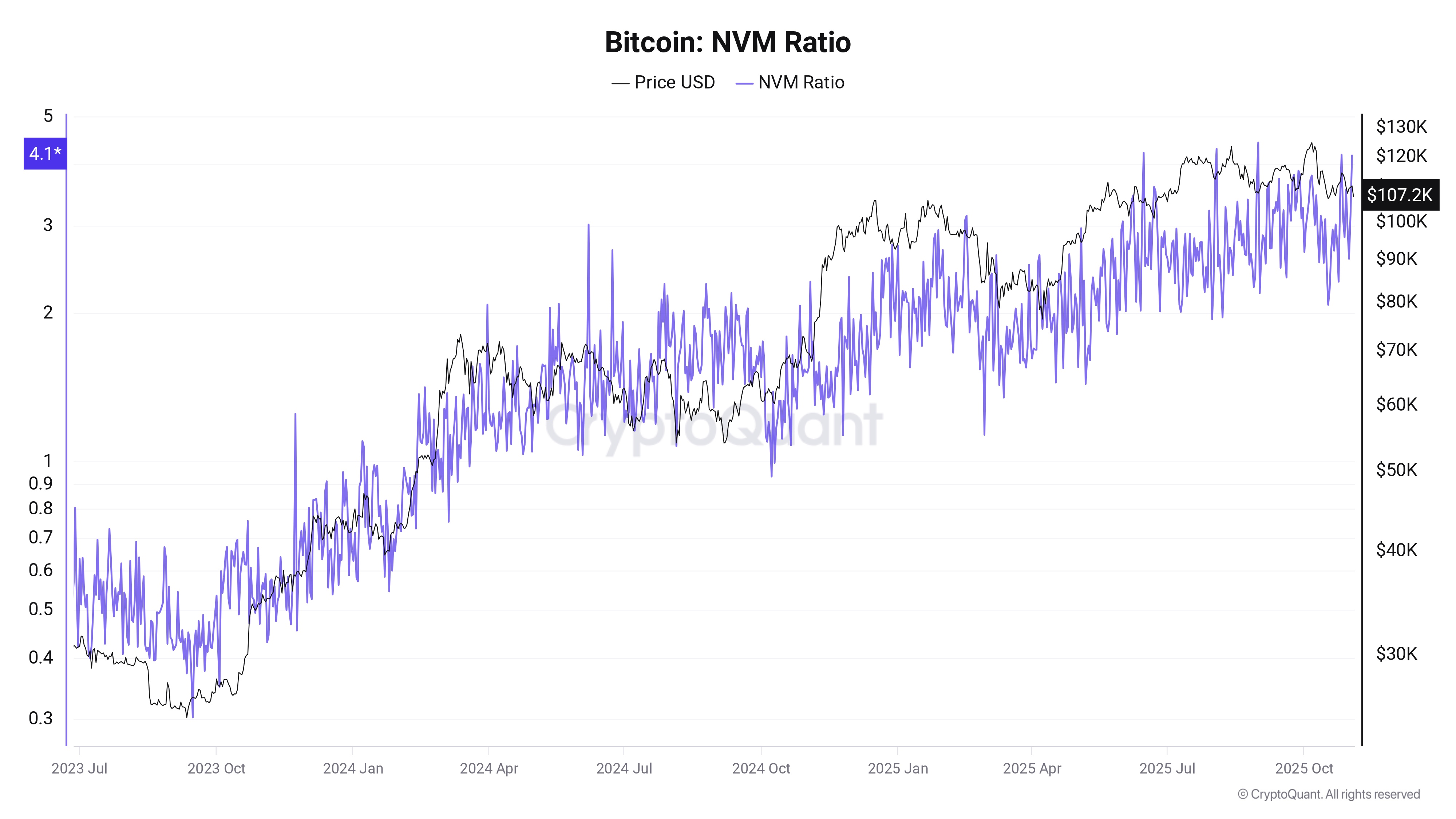 比特币网络价值与梅特卡夫比率 (NVM)。来源:CryptoQuant