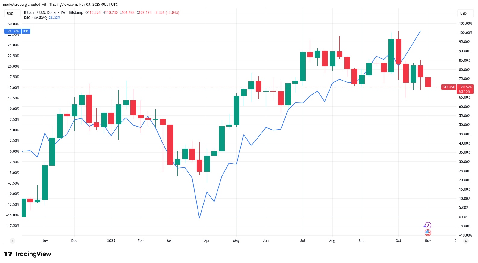 BTC/USD 与纳斯达克综合指数一周走势图。来源:Cointelegraph/TradingView