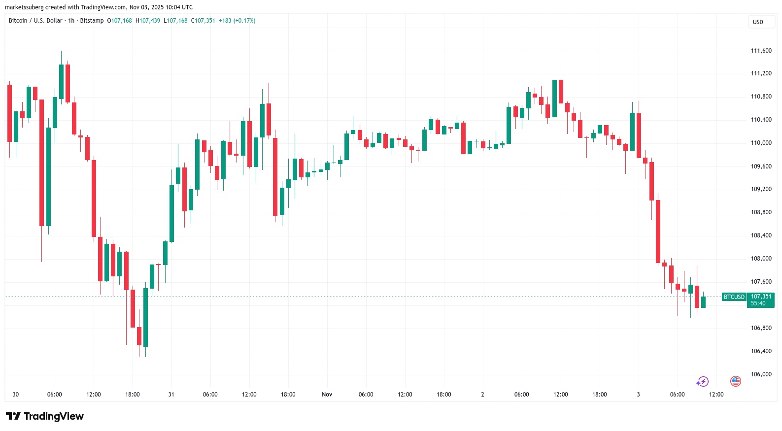比特币在当日收盘后立即下跌,回落至 107,000 美元。Cointelegraph Markets Pro 和 TradingView 的数据显示,BTC/USD 在交易员发出“周日暴涨”警告后,抹去了整个周末的涨幅。