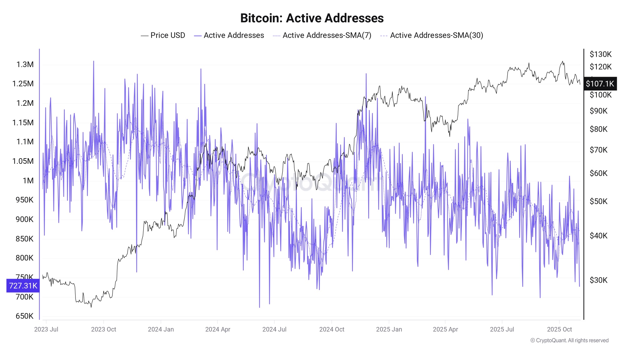 “截至 2024 年 11 月初,活跃地址约为 118 万个,而截至 2025 年 10 月 30 日,活跃地址数为 87.2 万个,下降了 26.1%。”撰稿人 Carmelo Aleman 在周末发表于 Quicktake 博客文章中写道。