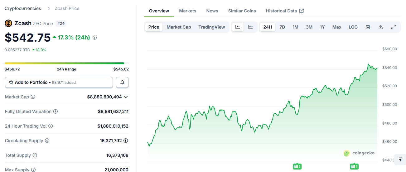 自9月1日以来,ZEC上涨了1,260%,超过门罗币,市值排名第25。