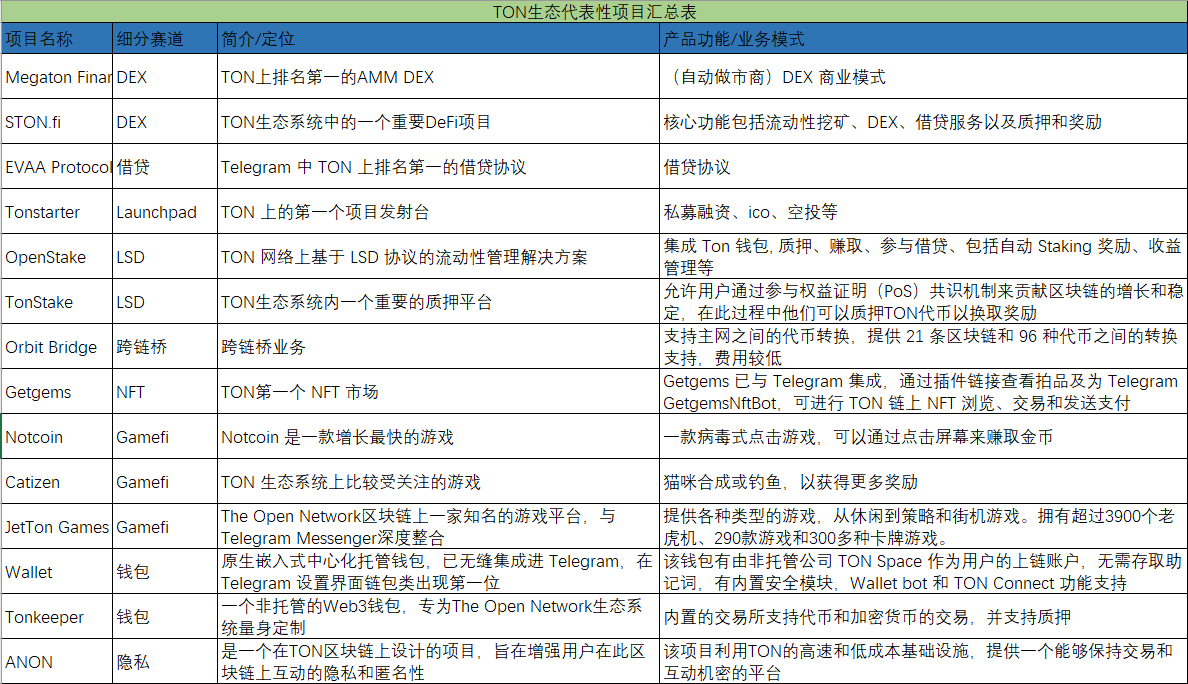 3、飞速增长的TVL数据:截止发稿前,TON的链上总锁仓价值(TVL)为3亿7千多万美金。月增涨率为85%。公链排名很快将跻身前20。 TON公链生态细分赛道盘点: TON公链生态中质押类项目13个、钱包类43个、跨链桥8个、工具与bot类114个、NFT类98个、社交类21、博彩类53个、DEX类16个、游戏类97个、开发者工具10个、电商类12个、Launchpad10个 仔细看这些细分领域,可以窥见出TON公链已经有比较丰富的生态基础。