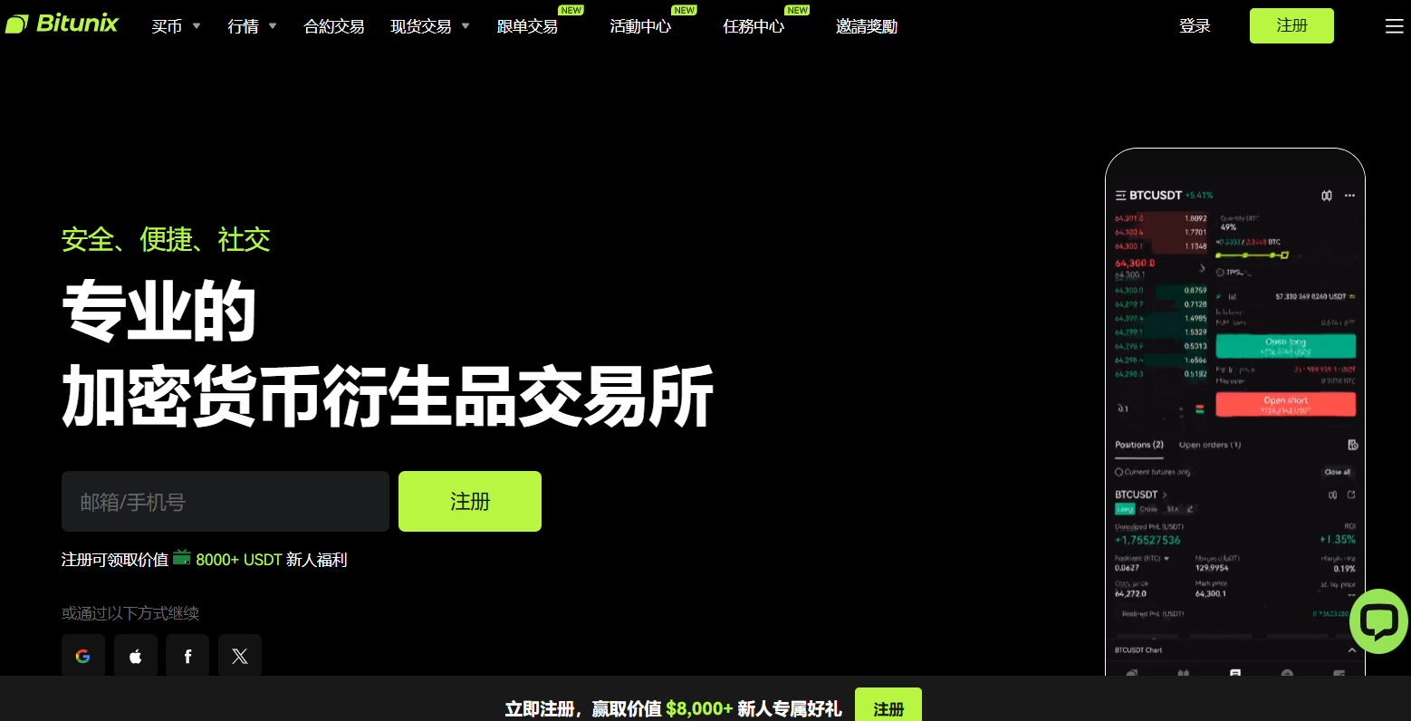 Bitunix 是一家总部设于香港的无KYC加密货币期货平台,主打匿名、高杠杆、简洁体验。平台支援500多笔交易对,包括BTC、ETH、SOL、APE、UNI等,提供永续合约与反向合约交易选项。