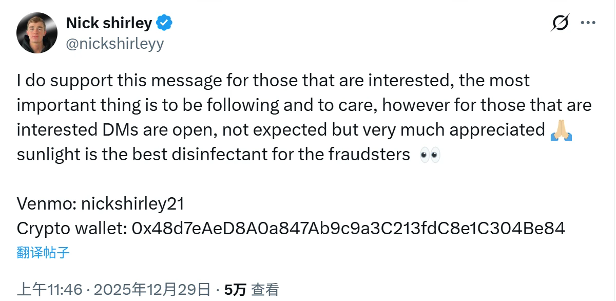 1小时前,Nick Shirley于X上po出Venmo和加密地址,明牌开放“打赏”。
