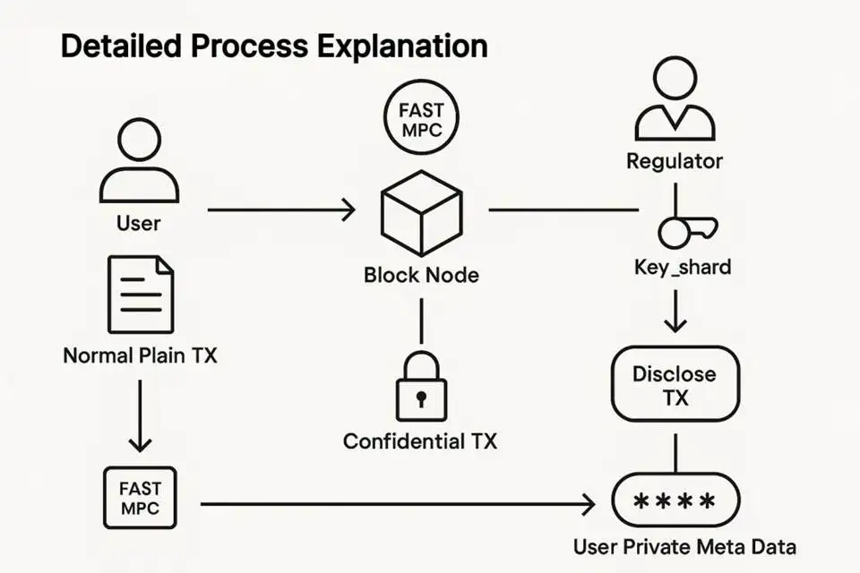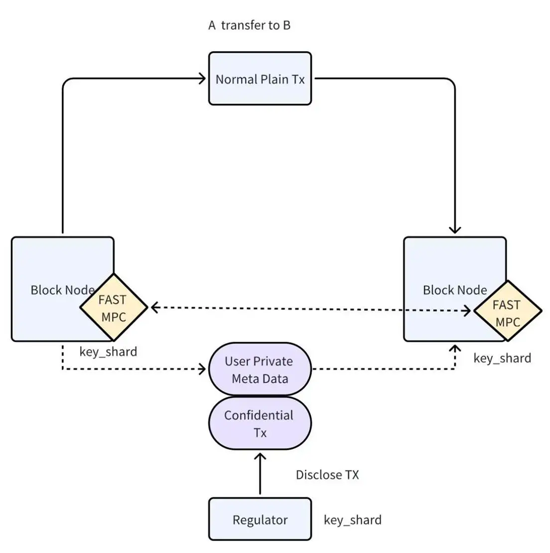 ○ 技术核心:分布式密钥生成与门限解密。系统预设一个由多方共同控制的监管公钥。对应的私钥以门限方式分片持有。仅当获得合法的司法命令时,这些独立方才能协同执行门限解密协议,恢复出主密钥并对特定地址的交易历史进行解密。此过程是透明、可审计且需多方协作的,防止了单方面的监控。