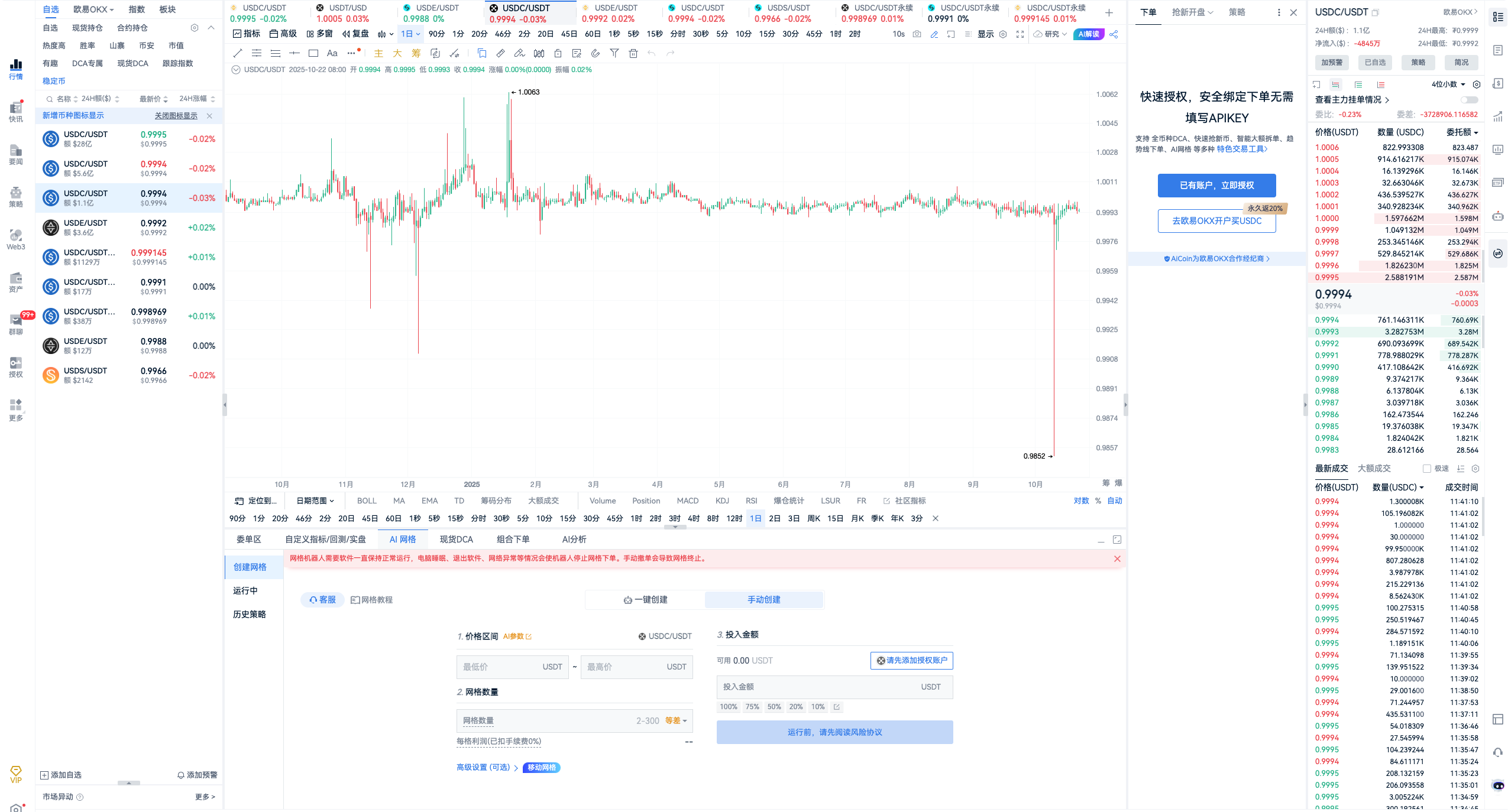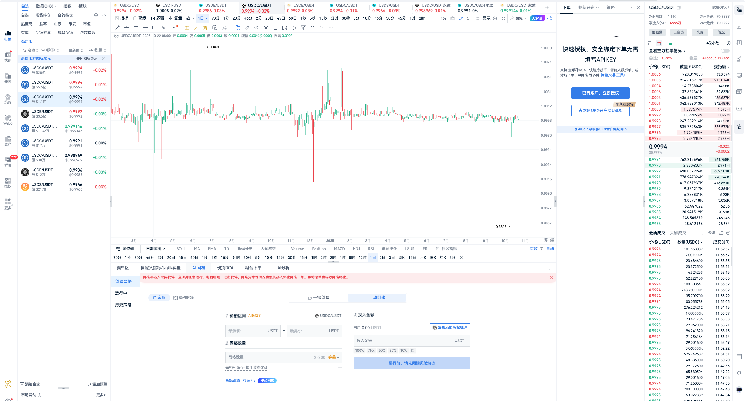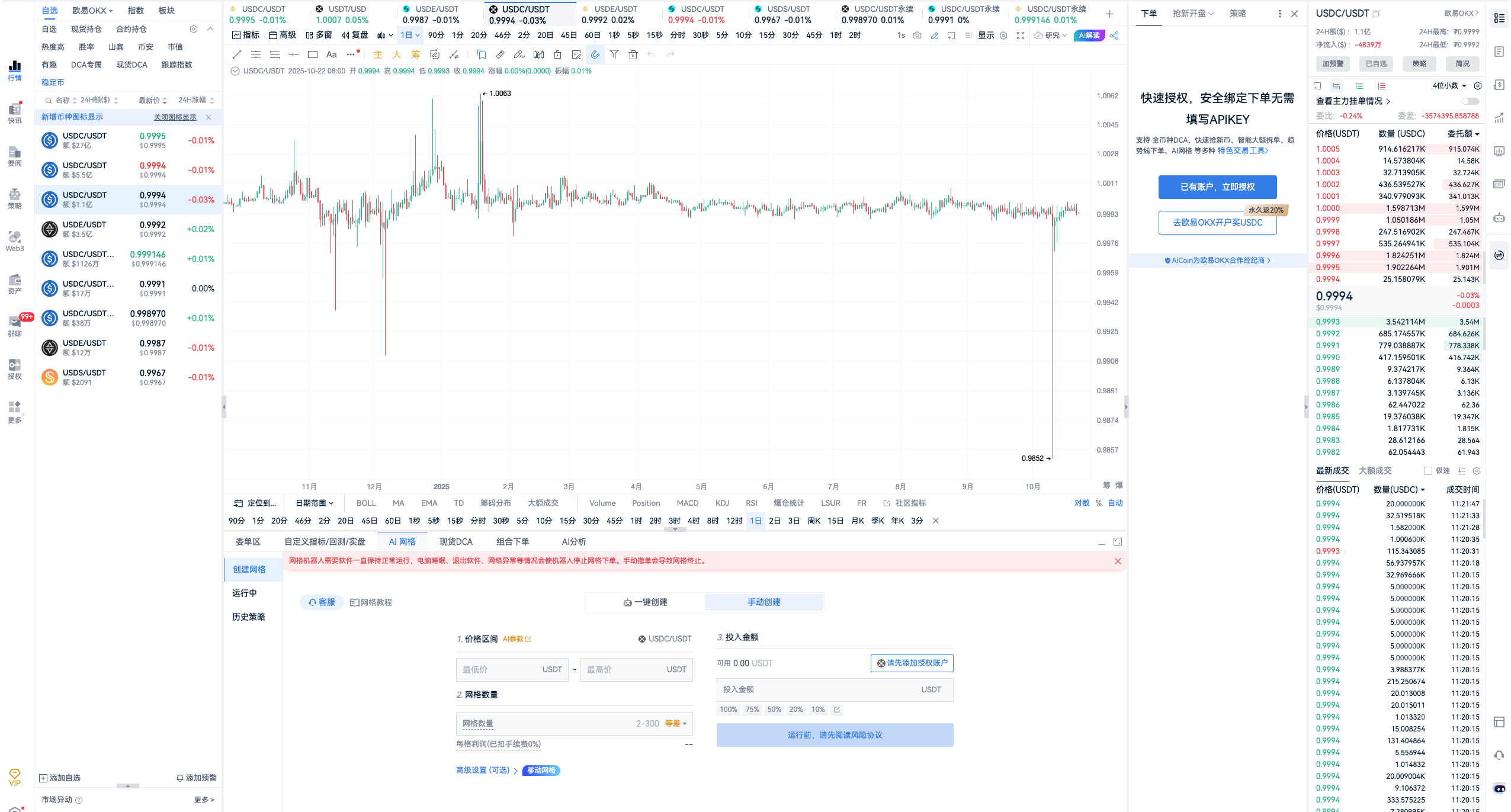 分析近期 USDC/USDT 的价格表现(如下图所示),我们可以观察到该交易对的最低价为 0.9852,最高价达 1.0063,中间振幅超过 2.14%;虽然稳定币价格的波动性低于传统加密资产,但这种微小波动正是网格交易策略获利的基础。
