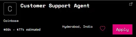相比之下,Coinbase在web3.career上对于「Customer Support Agent(客服支持专员)」岗位所开出的预期薪资水平,是6.9万–7.7万美元。