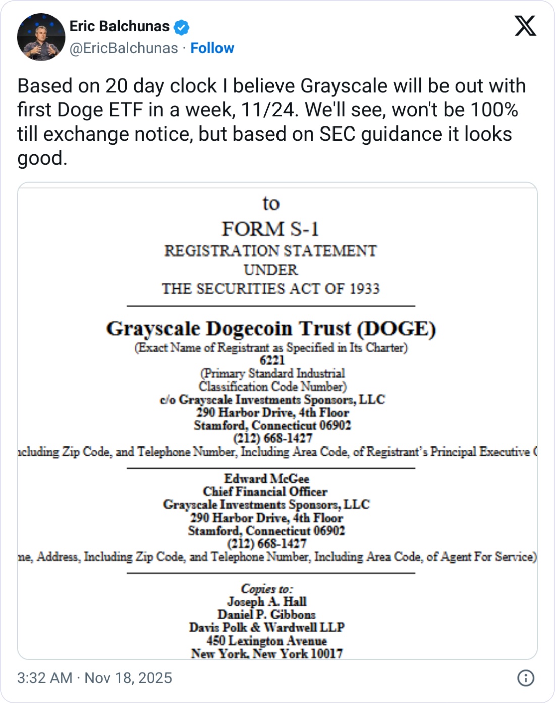 巴尔丘纳斯表示,他期待狗狗币的出现。Grayscale的ETF将于11月24日推出,这是基于本月早些时候提交的一份修订后的监管文件,该文件开启了20天的宽限期,如果美国证券交易委员会没有回应,该ETF就可以推出。