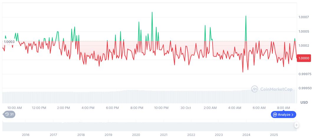 Tether USDT(USDT)日线图,截图来自CoinMarketCap,时间为2025年10月30日09:00 UTC。来源:CoinMarketCap
