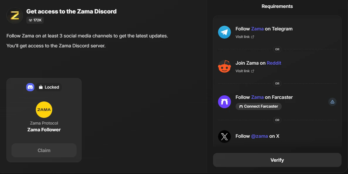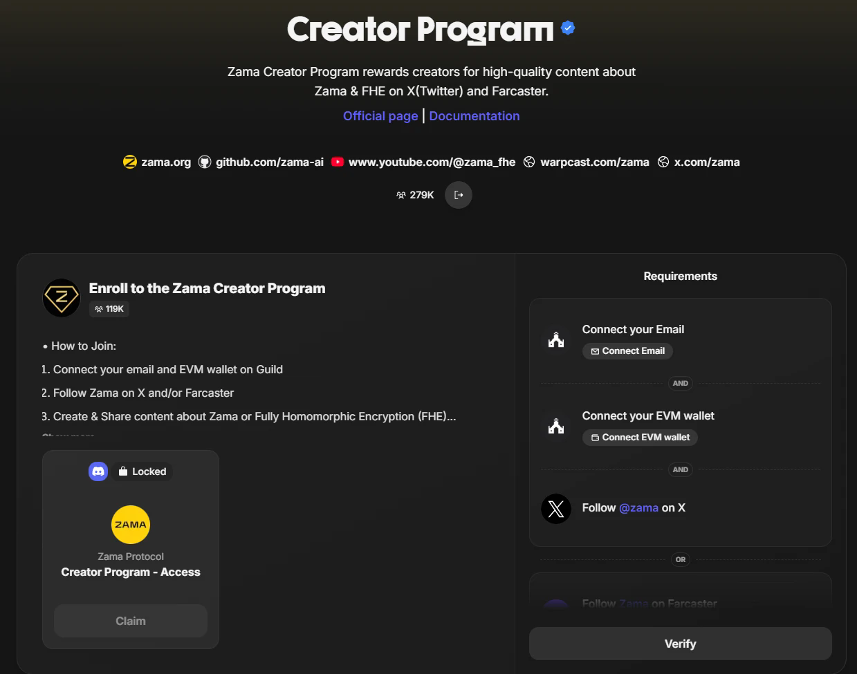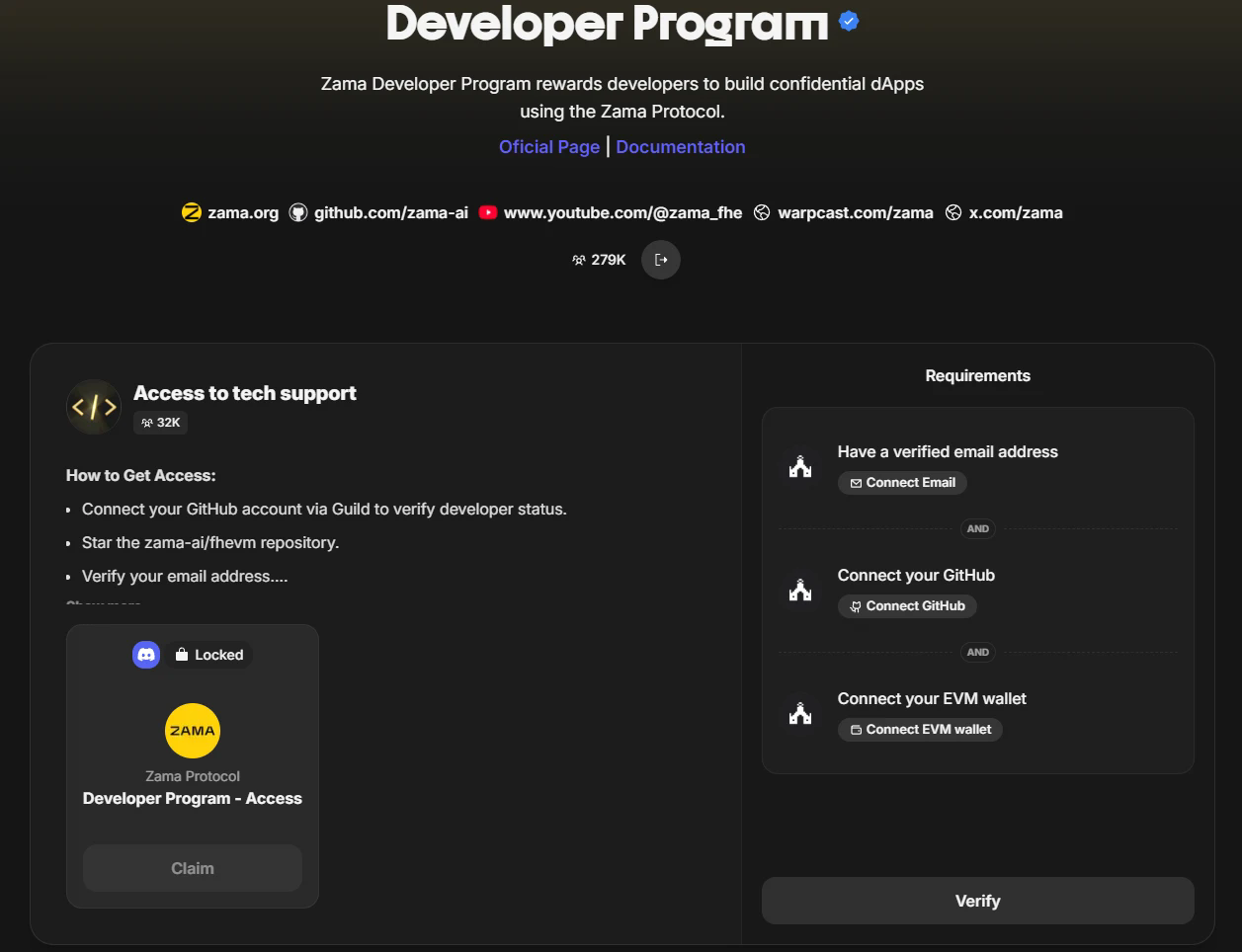 ● 基础任务:ting wallet to the Zama Guild,四个官方社区进入三个即可完成,并且可加入官方Discord频道获得身份角色。