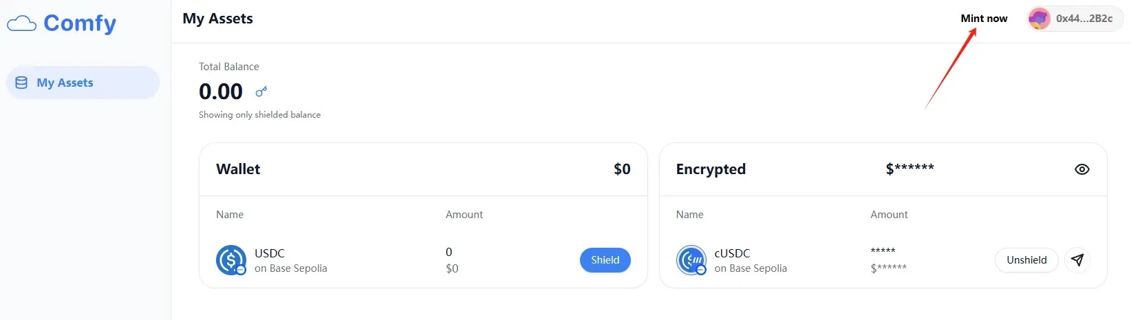 STEP 3. 进入Comfy项目交互网站(连接:https://comfy.inco.org/)后,点击“Connect Wallet”后选择“Mint now”去Mint USDC。