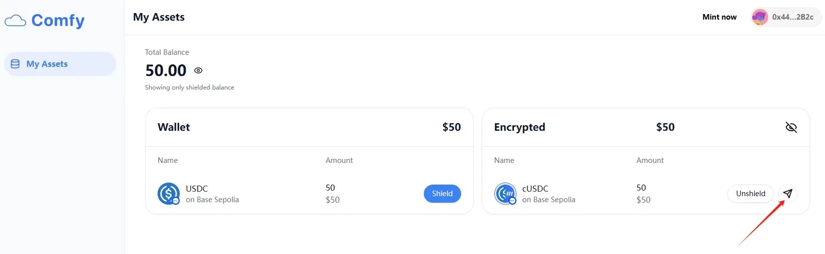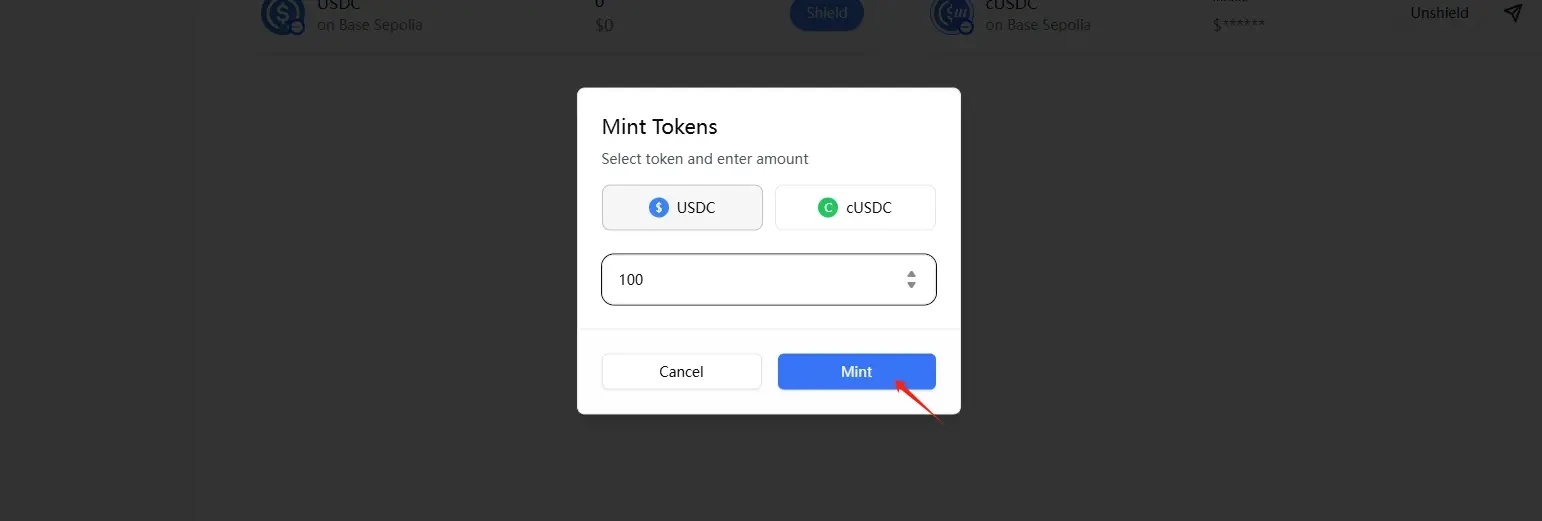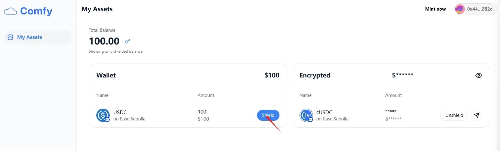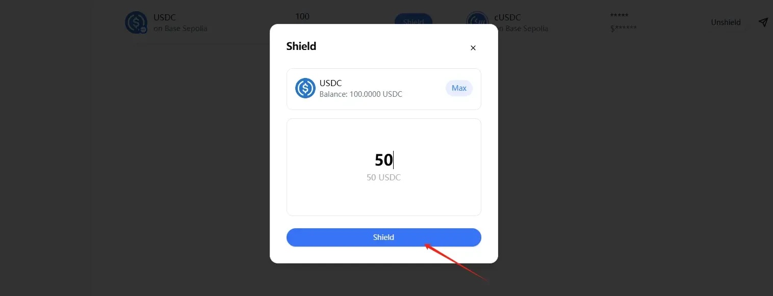 STEP 4. 选择“Shield”将一部分USDC兑换成cUSDC,再点击“Unshield”将部分cUSDC兑换为USDC。