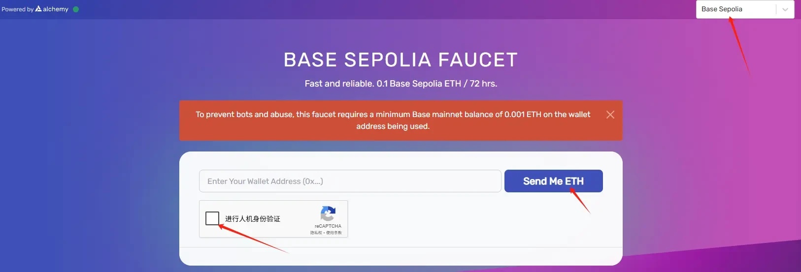 STEP 1. 进入领测试币网站(链接:https://www.alchemy.com/faucets/base-sepolia),选择“Base Sepolia”测试网络,完成人机认证后输入地址领取测试币ETH(需要钱包在Base主网有0.001 ETH才能领取)。