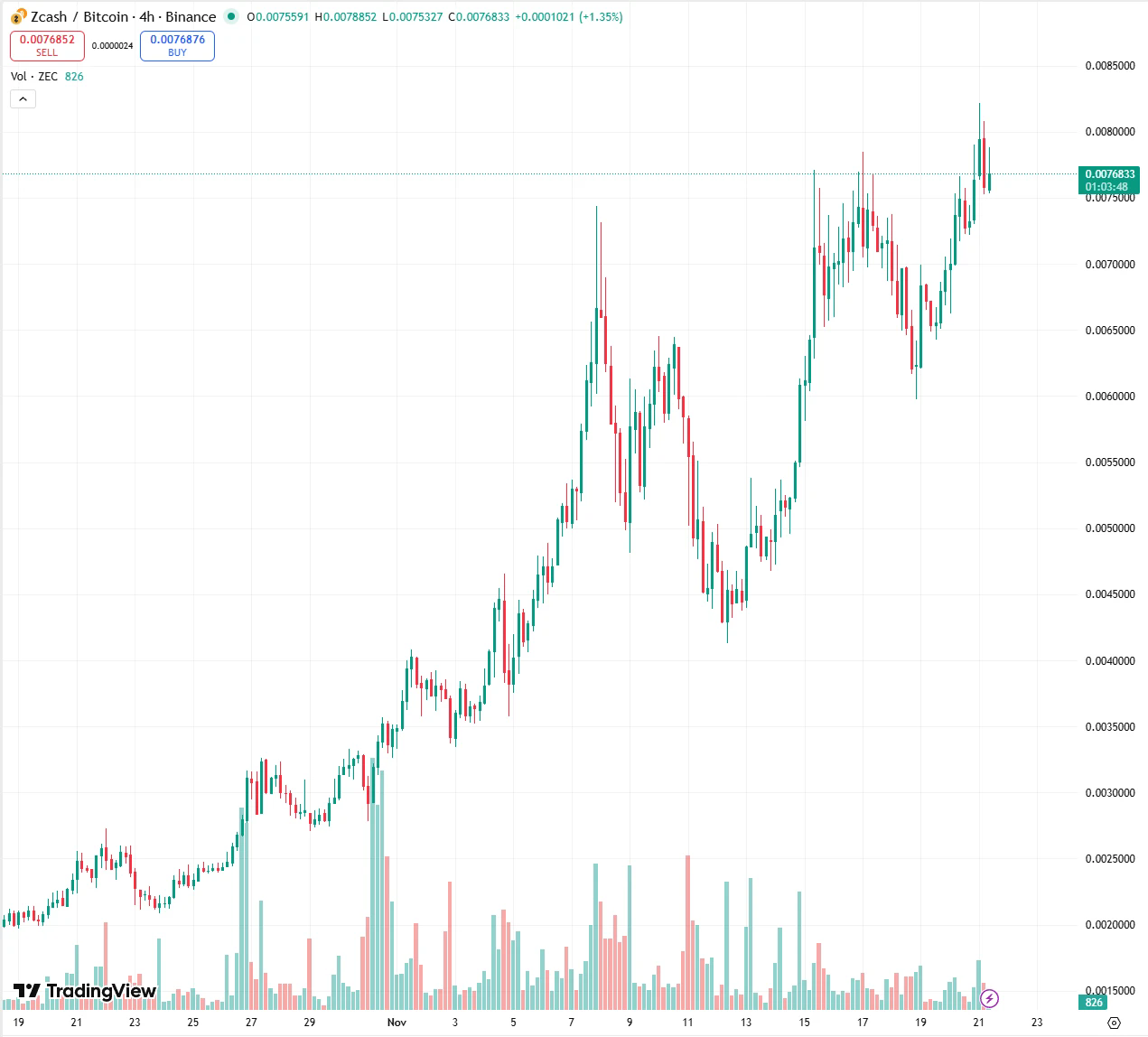 在大盘普跌的背景下,ZEC却逆势走出强势行情,今晨一度突破700美元,虽目前价格有所回落,但从ZEC/BTC的走势可以明显看出,ZEC相对于BTC持续走强,呈现与其中主流山寨币完全不同的走势。