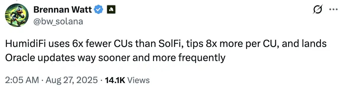 根据 Solana 核心开发商 Anza 的工程师 Brennan Watt 提供的数据,HumidiFi 使用了比 Prop AMM 曾经的龙头 SolFi 少 6 倍的 CU,并给了多 8 倍多小费。