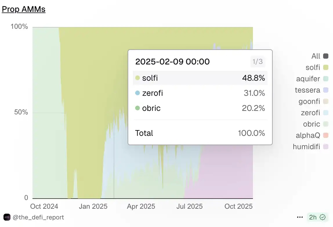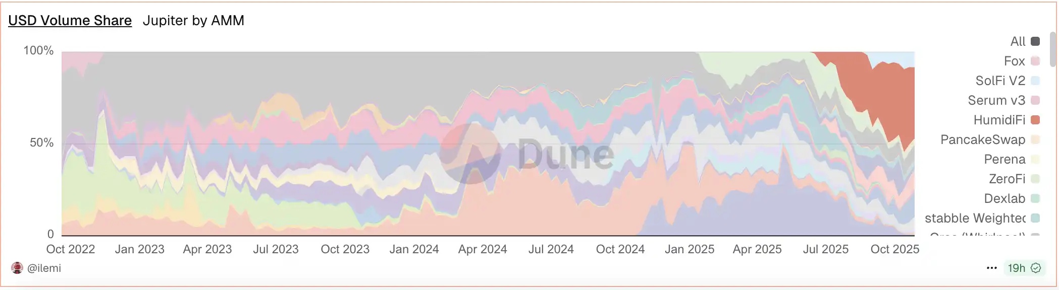 HumidiFi 在 Jupiter 路由中的渗透率也极高。作为 Solana 上占据 86.4% 市场份额的聚合器,Jupiter 的路由选择很大程度上决定了交易者的实际体验。10 月 20 日的数据显示,HumidiFi 在 Jupiter 中的市场份额高达 46.8%,是第二名 TesseraV(10.7%)的四倍多。
