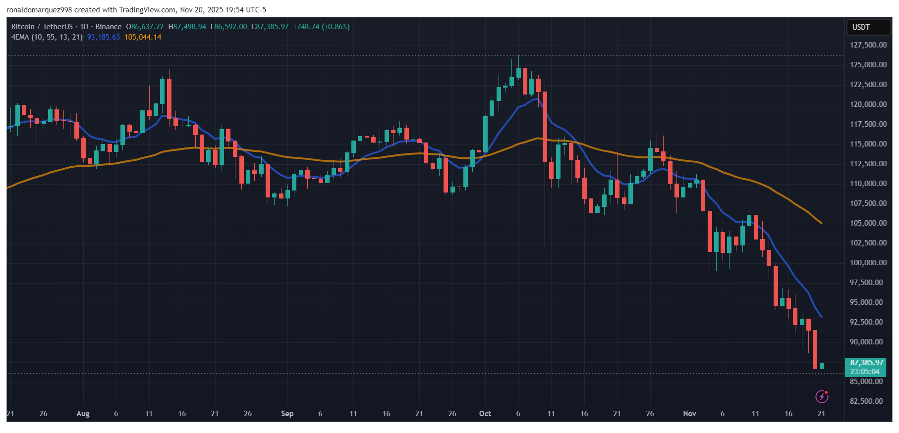 一日图表显示,比特币价格已从历史高点回落30%。数据来源:TradingView.com上的BTCUSDT图表。
