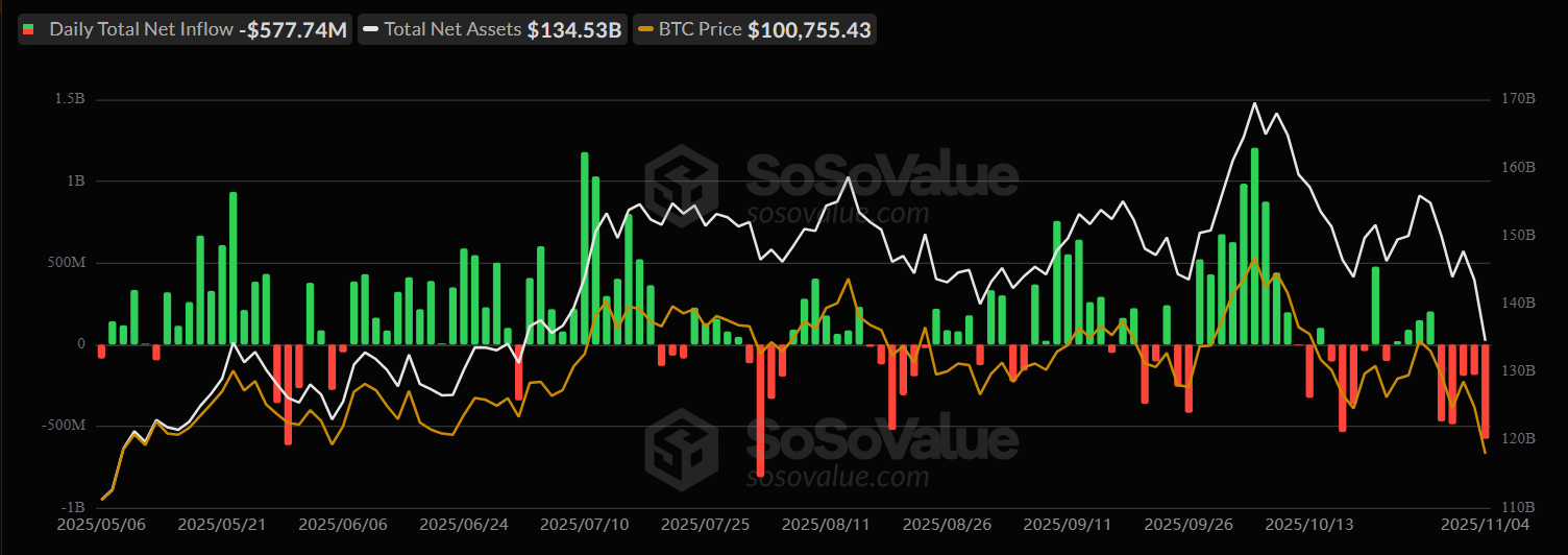 自 10 月 29 日以来,总部位于美国的比特币 ETF 已连续五个交易日出现资金流出,其中 11 月 4 日的资金流出量最大,超过 5.77 亿美元。Ark 和 21Shares 的比特币 ETF 昨日的资金流出量最大,超过 1.28 亿美元。