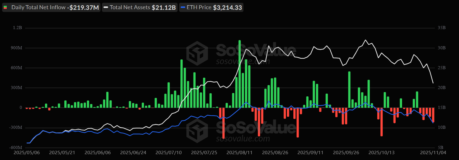 自 10 月 29 日以来,以太坊 ETF 也一直录得资金净流出。最大的资金流出日是 11 月 4 日,当日加密货币产品流出资金超过 2.19 亿美元。贝莱德旗下的 ETHA 昨日录得超过 1.11 亿美元的资金流出。