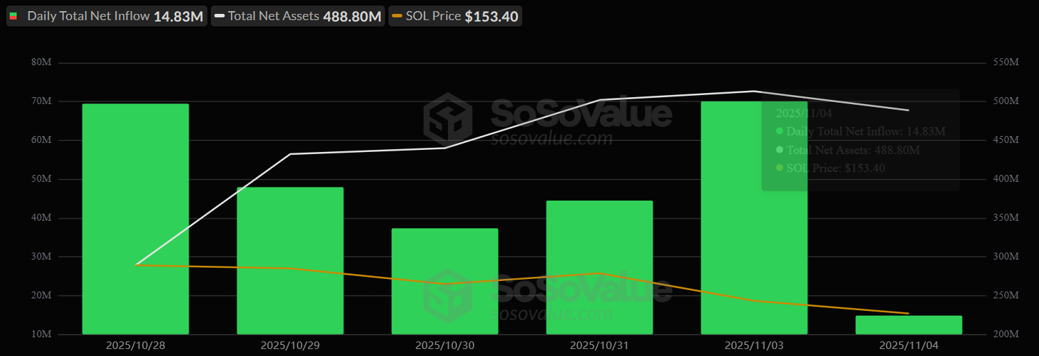 11 月 4 日,SOL ETF 的资金流入超过 1480 万美元,标志着加密货币产品连续第六天实现正资金流入。