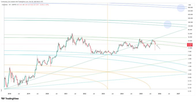 从周线图来看,$LINK依然遵循江恩方阵与江恩弧线构筑的技术框架,该动态支撑位自2018年以来持续生效。近期在12-14美元区间的回调恰好触及弧线下沿,验证了结构完整性。分析师广东猫(@cantonmeow)指出,当前水平位与斜向支撑形成的压缩区域正构筑突破基底,10.50-11.00美元区间作为江恩方阵1/8分位,历来吸引长期投资者进场积累。