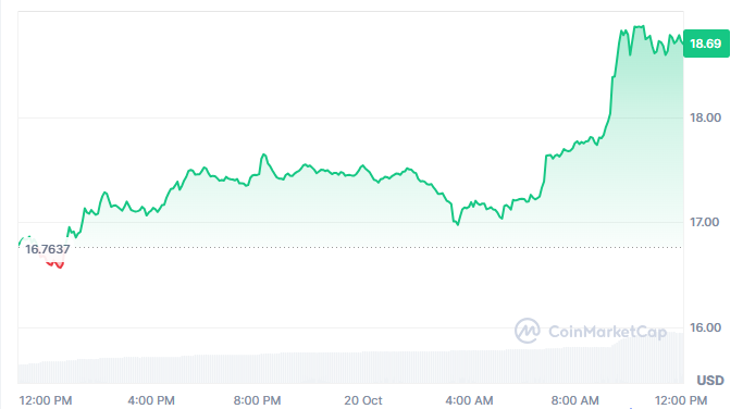 Chainlink日前实现单日12.2%涨幅,最高触及18.71美元。伴随价格跃升的是单日126.88%的交易量增长,达到10亿美元规模。其市值回升至126.8亿美元,显示市场兴趣重燃。