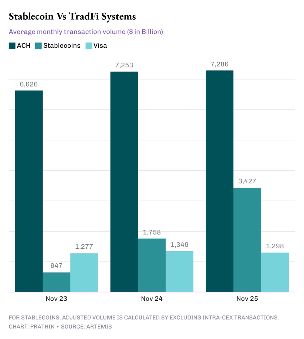 只需看一眼Artemis数据集,比较链上稳定币与Visa、自动清算中心(ACH)和其他传统金融系统的交易量,就会发现它们之间的差距正在迅速缩小。