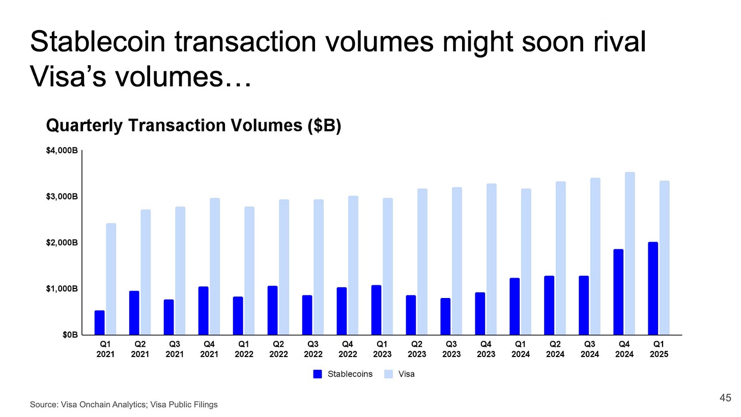 每个季度,稳定币交易与Visa处理的交易之间的差距都在缩小。